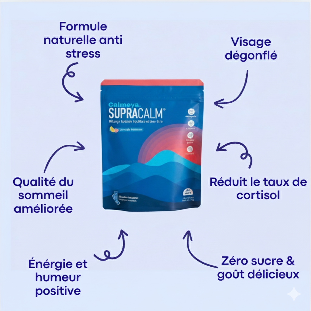 Un cortisol élevé en permanence génère une inflammation systémique dans tout ton corps. Cette inflammation se voit : visage bouffi, ventre distendu, peau terne, et sensation de lourdeur généralisée. Le Magnésium Glycinate et l'Ashwagandha présents dans SupraCalm aident à réduire cette inflammation, permettant à ton corps de dégonfler naturellement et à ta peau de retrouver son éclat.