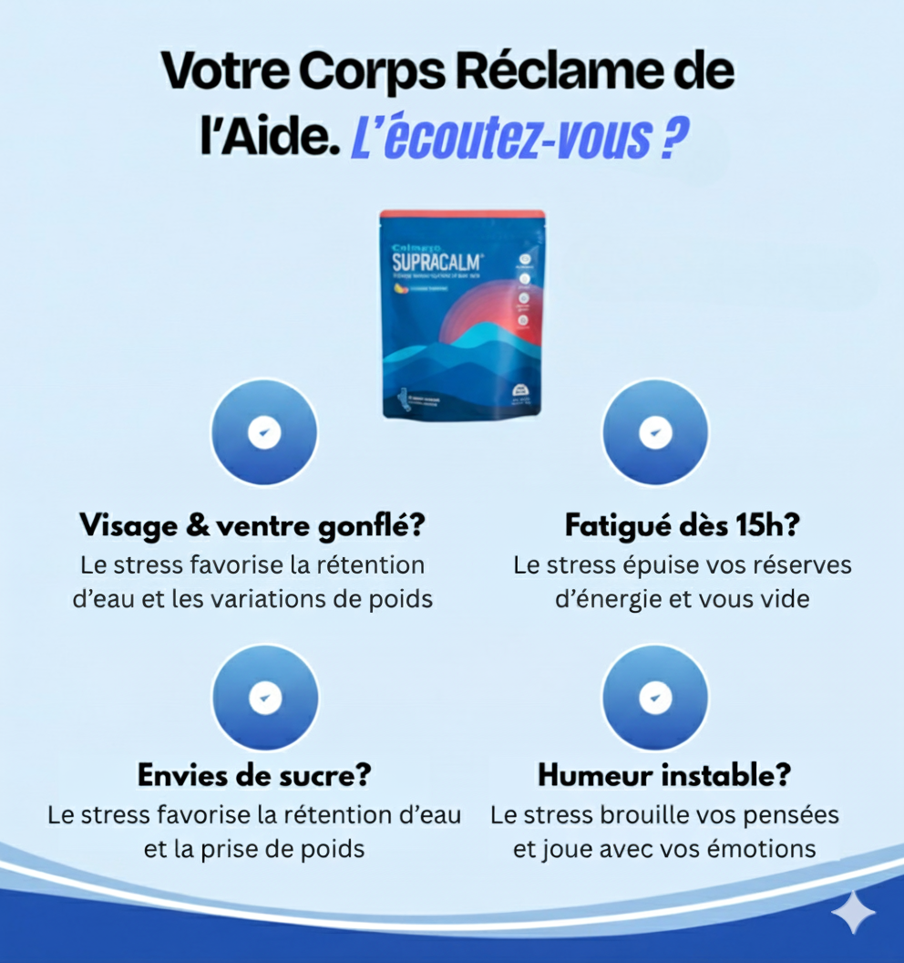 Lorsque le cortisol reste élevé en permanence, il envoie un signal de "danger" à ton corps, qui se met alors à retenir l'eau et à stocker massivement au niveau du visage, du ventre et des cuisses. Cette rétention d'eau crée un aspect gonflé et bouffi, surtout visible le matin au réveil. SupraCalm, avec son ingrédient Ashwagandha, aide à réguler les niveaux de cortisol, ce qui permet à ton corps d'éliminer naturellement l'eau en excès et de dégonfler visiblement.